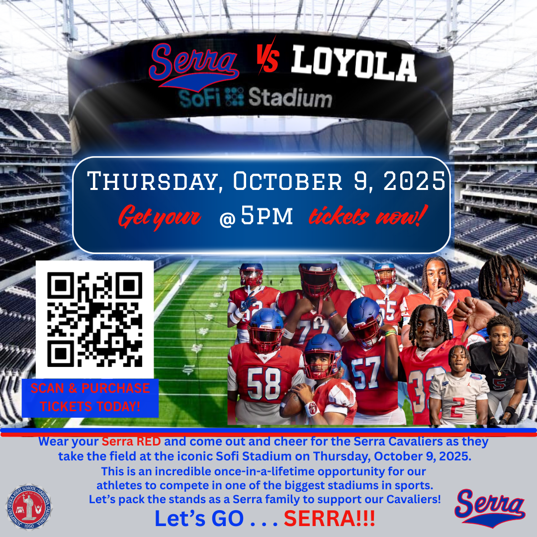 Come out and support the Cavaliers! It's a Serra RED out game! Wear your Serra RED and bring the Serra family spirit & pride to fill the Sofi Stadium for our Cavaliers and Serra.